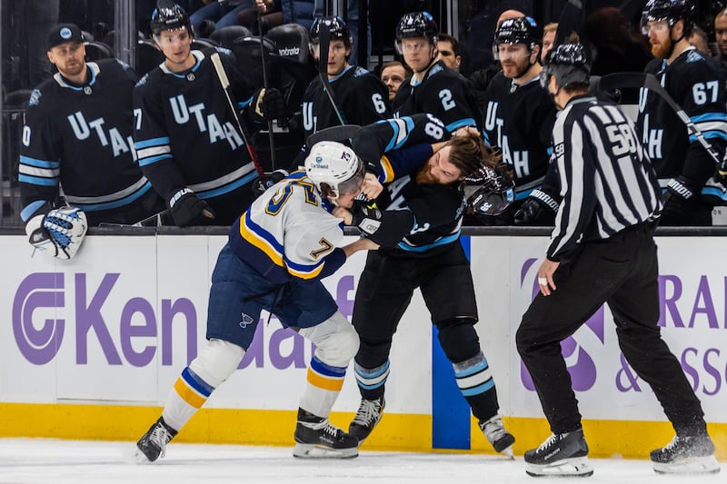 Utah Hockey Club center Liam O’Brien (38) and St. Louis Blues defenseman Tyler Tucker (75) engage in a fight during an NHL game held at the Delta Center in Salt Lake City on Saturday, Jan. 18, 2025. | Tess Crowley, Deseret News