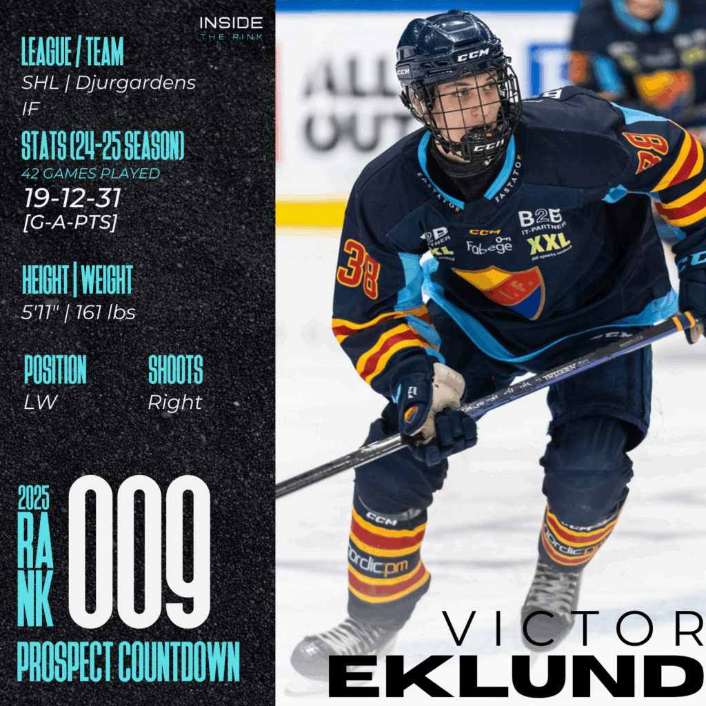 Victor Eklund is an upcoming high-end forward prospect eligible for the 2025 NHL Draft and recorded 19 goals and 31 points for Djurgårdens IF this past season. Eklund had great success playing in a men’s league and ultimately helped the team reach promotion. Historically, the league is not a very high-scoring league, so Eklund’s 31 points are the highest of any draft-eligible player in the league.