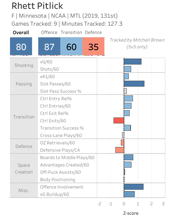 After being drafted by the Montreal Canadiens, Rhett Pitlick signed with the Bakersfield Condors after his time in the NCAA came to a close this year. In six games with Bakersfield, Pitlick had six assists and a +8 rating. Standing at 5’10” and just 170 pounds, Pitlick’s path to the NHL is as a third line secondary scorer, but he could prove to be a useful extra forward in the near future. Rhett’s brother, Rem, had one good NHL season in 2021-22 (37 points for Minnesota and Montreal), but has since largely been trying to find his game in the AHL. Their cousin, Tyler, has largely bounced back and forth between the NHL and AHL, but has accumulated 420 NHL appearances. It’s a hockey family, and Rhett is the smallest — but he may have the most offensive impact. While he does not have any 2024-25 data because of a school transfer, Mitchell Brown and Lassi Alanen’s NCAA tracking data from his third season at the University of Minnesota marked him as one of the better offensive play-drivers in college.