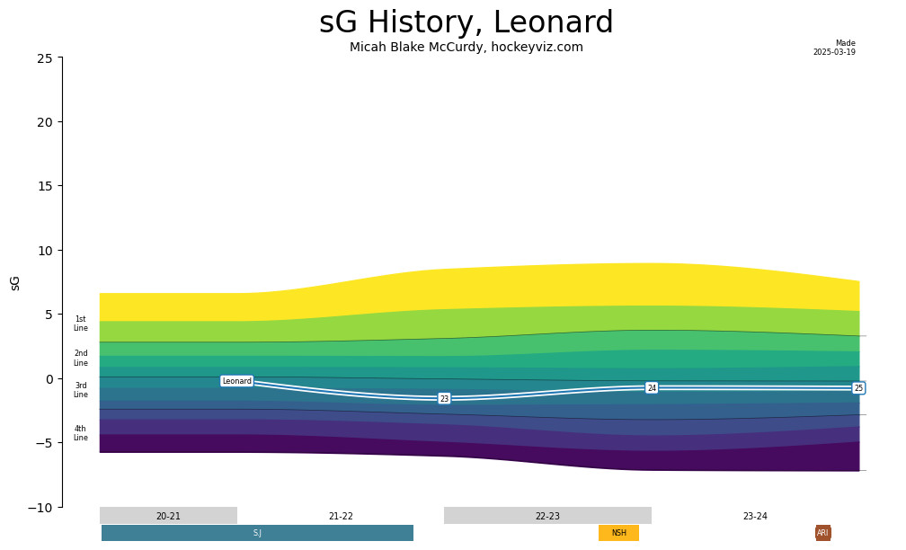 John Leonard just completed his fourth AHL season, scoring a career-high 36 goals and 61 points with a +21 rating for the Charlotte Checkers. Prior to this season, Leonard’s career highs were 17 goals and 44 points in his age-24 season for the Milwaukee Admirals. Additionally, Leonard has appeared in 70 NHL games, scoring six goals and 11 assists, mostly playing for the San Jose Sharks in the 2020-21 season, when he was just 22 years old. With good underlying numbers in his few NHL appearances, Leonard may very well be someone flying under the radar.