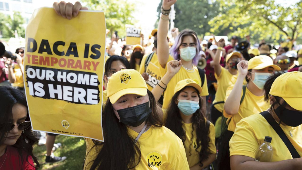 Susana Lujano, left, a dreamer from Mexico who lives in Houston, joins other activists to rally in support of the Deferred Action for Childhood Arrivals program, also known as DACA, at the U.S. Capitol in Washington on June 15, 2022. (AP Photo/J. Scott Applewhite, File)