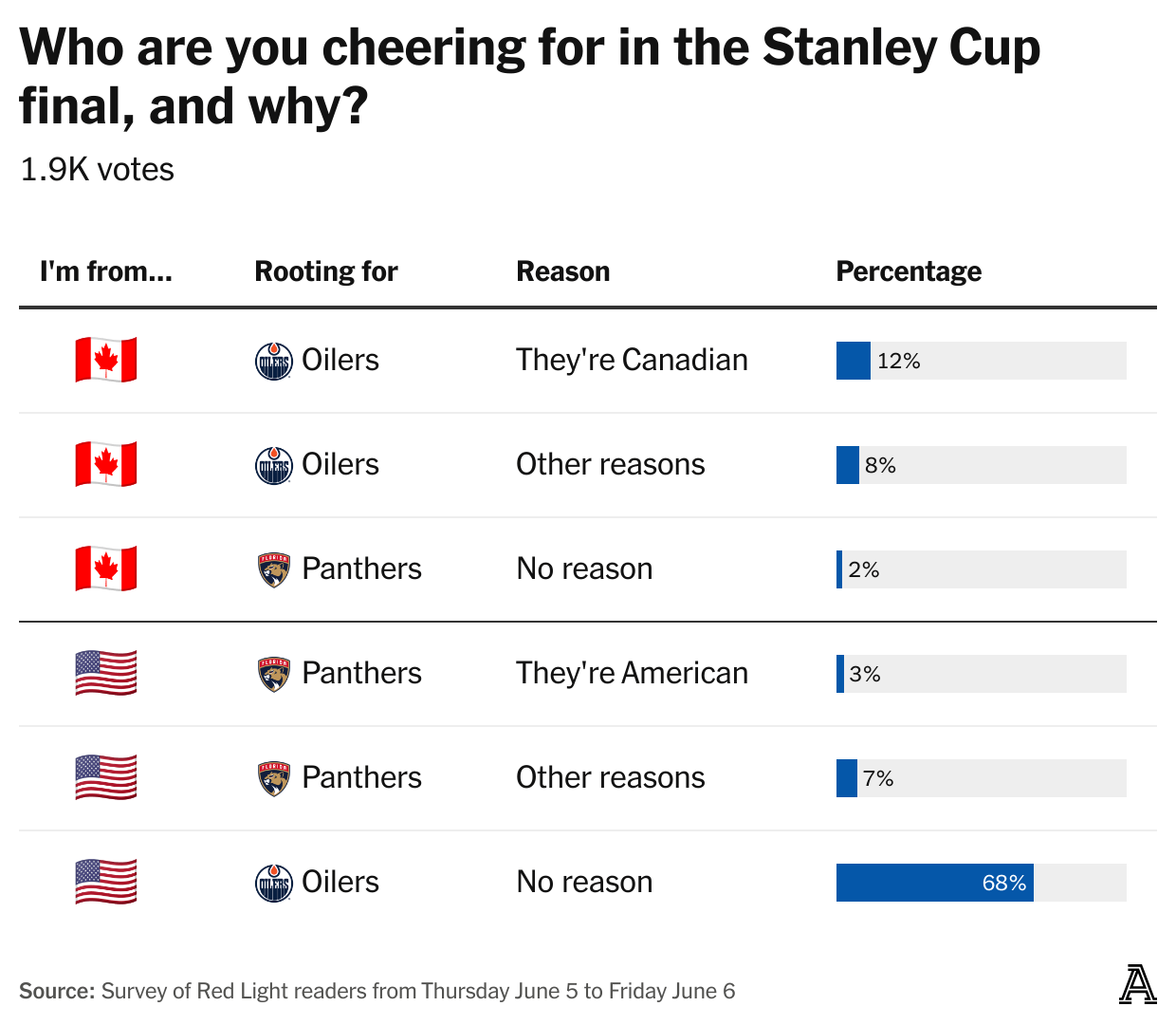Up north, we’re all-but-unanimous in backing the Oilers, and 60 percent of the Edmonton bandwagon says it’s because they’re Canadian. That’s a majority, but not as much as you might expect given how much the “bring Stanley home” message has been beaten into the ground up here.