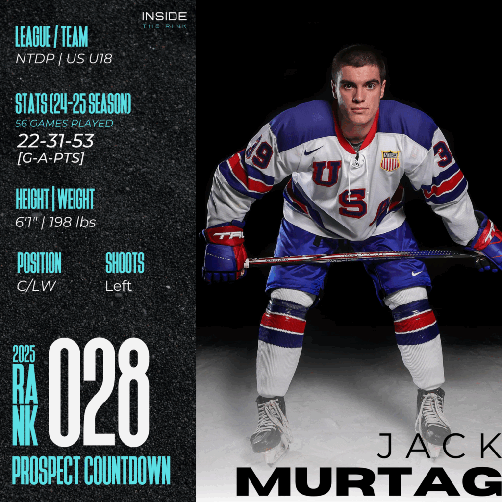 At 6 feet and 200 pounds, Murtagh is physically mature, powerful, and deceptively quick. He’s one of the strongest players on the NTDP roster in off-ice testing. Coaches rave about his gym numbers—strength coach Joe Meloni even called him “a freak athlete.” That strength translates to his game. He battles through contact, wins 50/50 pucks, and has a shot that explodes off his stick thanks to a full-body motion that uses every muscle group.