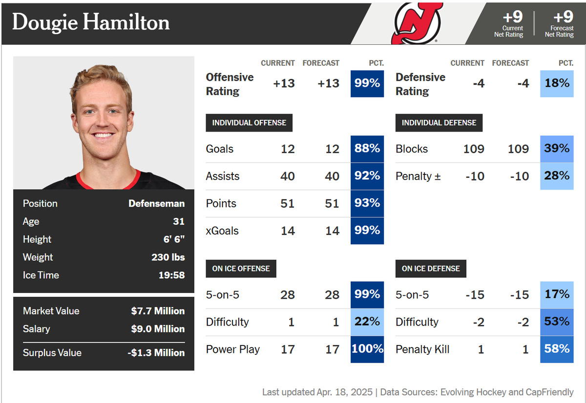 Hamilton might be slightly overpaid at this point of his career, but its not by an egregious amount when considering what he brings to the table offensively. He still sees plenty of time on the power play for the Devils…..only Jack Hughes got more ice time per game with the man advantage last season, and 37.5% of Hamilton’s points from last season came on the power play. Considering the Devils had one of the best power plays in the league last season, how vital the power play was to the team’s success, and the Devils need for more offense in general, that does matter. The one “yeah, but” with Hamilton offensively is that he had his second-worst season from a shooting percentage perspective, converting at a 4.8% rate. Only his first season in NJ was worse.