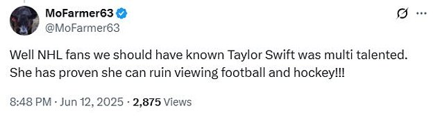 ‘Well NHL fans we should have known Taylor Swift was multi talented. She has proven she can ruin viewing football and hockey!!!’ one fan said.Â