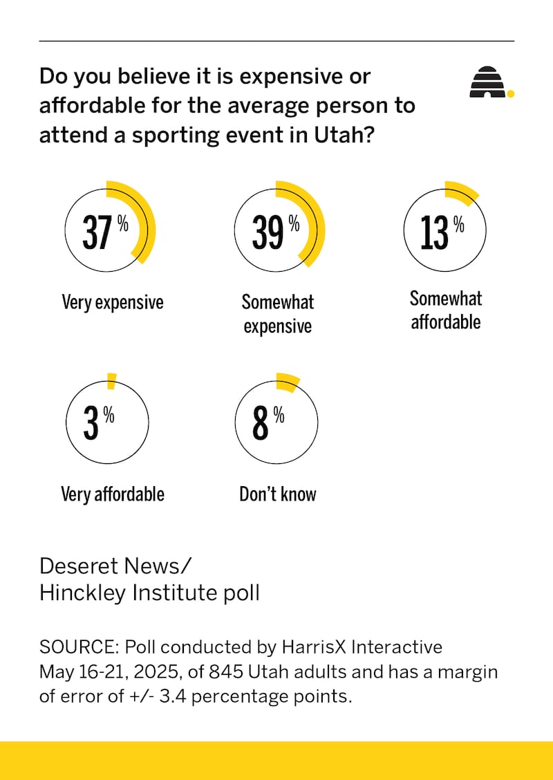 A new Deseret News/Hinckley Institute of Politics poll found slightly more than three-fourths of Utahns say it is expensive rather than affordable for the average person to attend a sporting event in-person in Utah. Only 12% see the cost as somewhat affordable, while even less than that, 3%, say going to a game in person is very affordable.