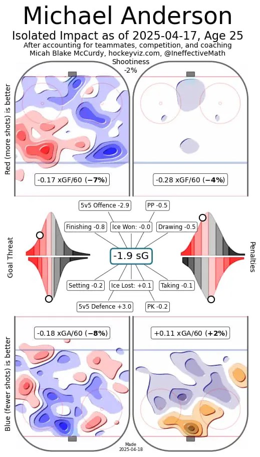 When looking at the rate of the highest quality chances against for all defencemen with at least 1000 5v5 TOI this season, three Kings defenders rank in the top-24 in the NHL. That share grows to three out of 18 when only considering playoff teams. According to HockeyViz, one of the most respected public analytic models, the Kings’ top-four defencemen are some of the most defensively sound players in the entire league. Anderson leads the charge.