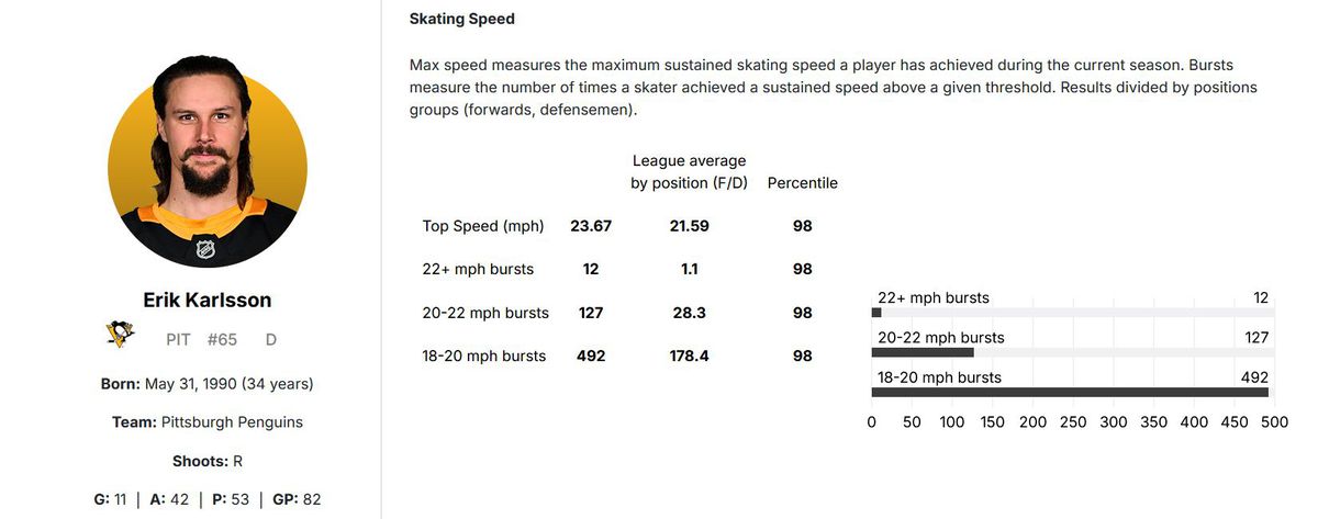 A little more on Karlsson since his data is fascinating. It’s easy to remember the frustrating bad plays where he’s floating in space after turning the puck over — the video from his season has a lot of flaws — but considering he’s 34-years old his ability to motor around the ice really is something incredible. He can turn on the jets, all the ability is there and you can see why GM Kyle Dubas would call him out and challenge this player publicly to pull it together.