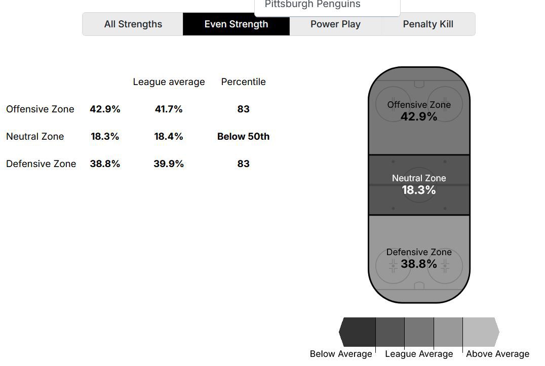 Tooling around on NHL Edge, the league’s player and puck tracking information and came across some interesting data points for the Penguins. Let’s jump right in with a look at where the Pens played at even strength over the course of the 2024-25 season.