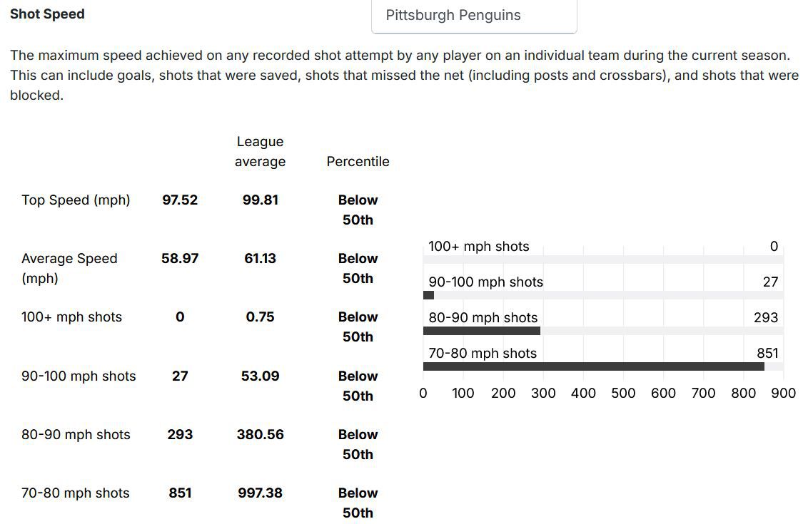 The Pens might need to hit the weight room, adjust their stick flexes or better yet add some stronger players because their shot speeds are downright pathetic relative to the rest of the NHL. You can get around that with well-placed shots or jamming ugly goals in from the front but it’s stood out the team doesn’t have very many players that can blast it. Evgeni Malkin only had one 90+ mph shot all season, back in the day he would launch ‘em. Erik Karlsson provided the team’s fastest shot of the season (97.52 mph) and had 13 out of Pittsburgh’s 27 shots that were recorded at 90+ miles per hour.