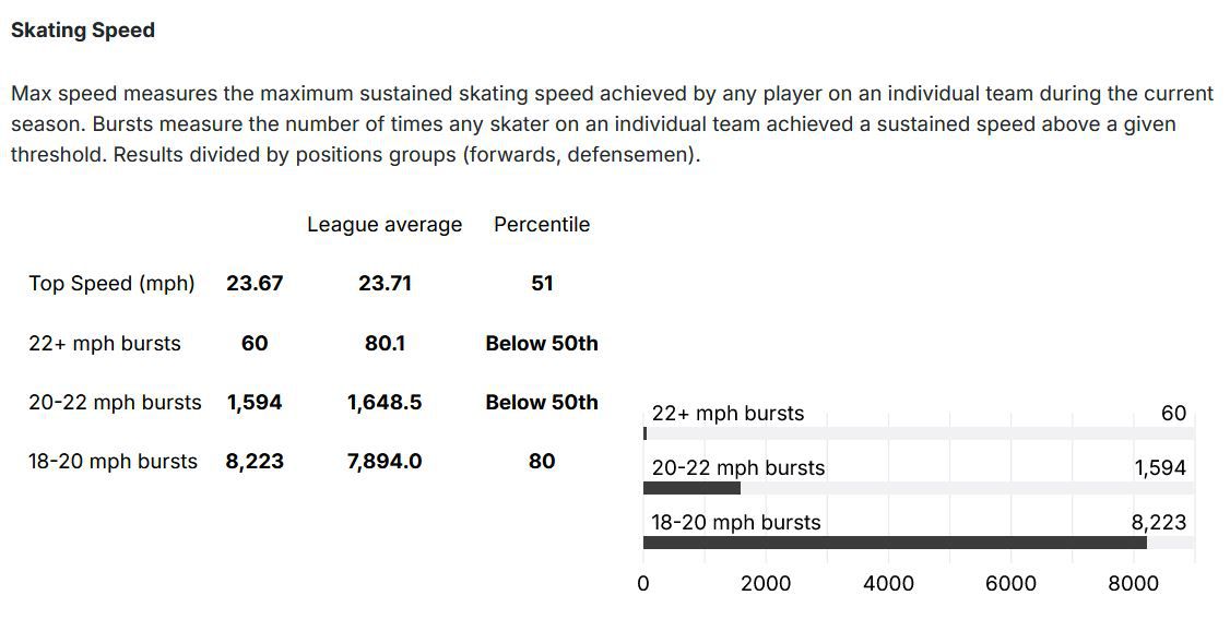 Sadly, it shows that this is a 38-year old’s chart who has had two major knee reconstructions. Would have loved to see NHL Edge around from 2006-11 to see what the galloping Malkin’s data looked like back then in his prime. Possibly the peculiar thing is that Malkin still can get going, but his top gear to top 20 mph isn’t there any longer. He only played 68 games and at an average of 17:47 per game it’s not like his ice time was sky high but he was still able to get going with some burst…Just with a very clear limit of being in 18-20 range.