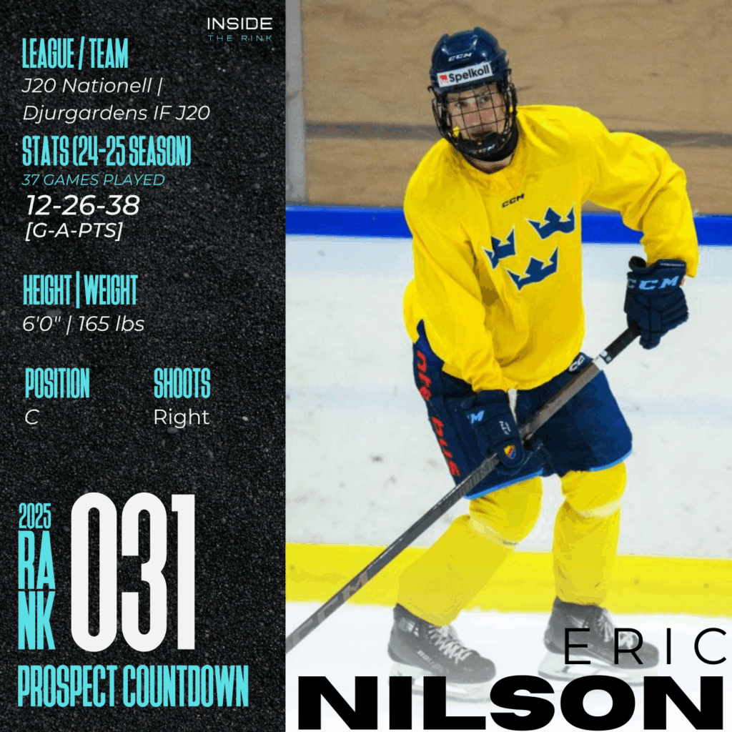 Eric Nilson is ranked by some hockey evaluators in the top 40 in scouting reports, some ranking him within the top 50 of the upcoming NHL Draft, and a late first-round to early second-round selection as center. The following list will show the scouting rankings for Eric Nilson: