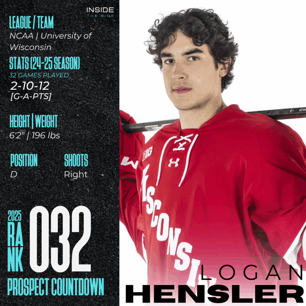 Logan Hensler is one of the more fascinating, complicated prospects in the 2025 NHL Draft class. On paper, he’s everything you’d want in a modern NHL defenseman: size, mobility, poise, and a right-handed shot. The right-hander is 6’2″, nearly 200 pounds, and played his first year at the University of Wisconsin after two seasons with the U.S. National Team Development Program. He doesn’t put up big numbers—just 12 points in 32 games this season—but if you’re only watching the stat sheet, you’re missing the essence of his game. Hensler is a smooth skater. He moves swiftly for his size, edgework is sharp, and his stride looks effortless, whether retreating into the defensive zone or gliding along the offensive blue line. It’s the first trait that jumps off the screen when you watch him play. The kid makes quick transitions and corrects mistakes before they become dangerous. You see it in moments when he’s beaten for half a step in the neutral zone, only to recover with positioning, angle his man out wide, and kill the rush before it starts. His lateral agility allows him to maintain tight gaps and funnel attackers away from high-danger areas. His transition work and four-way mobility are excellent for a teenager still growing into his frame.
