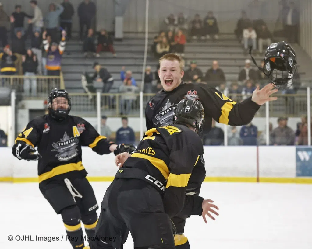 Taeo Artichuk celebrates the game winning goal in game 6 of the OJHL championship series