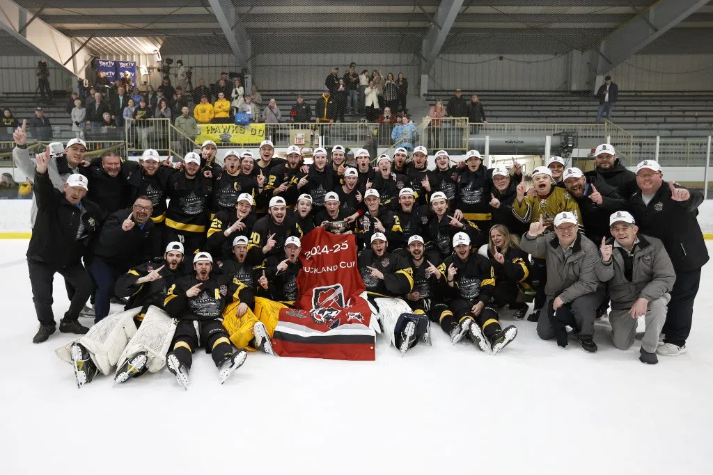The Golden Hawks celebrate their second ever league championship Wednesday evening. (Michelle Malvaso/OJHL Images)
