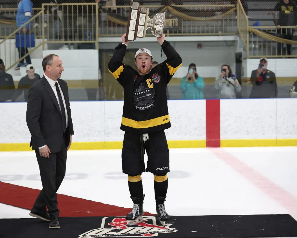 Corbin Road lifts the trophy from OJHL Commissioner Marty Savoy
