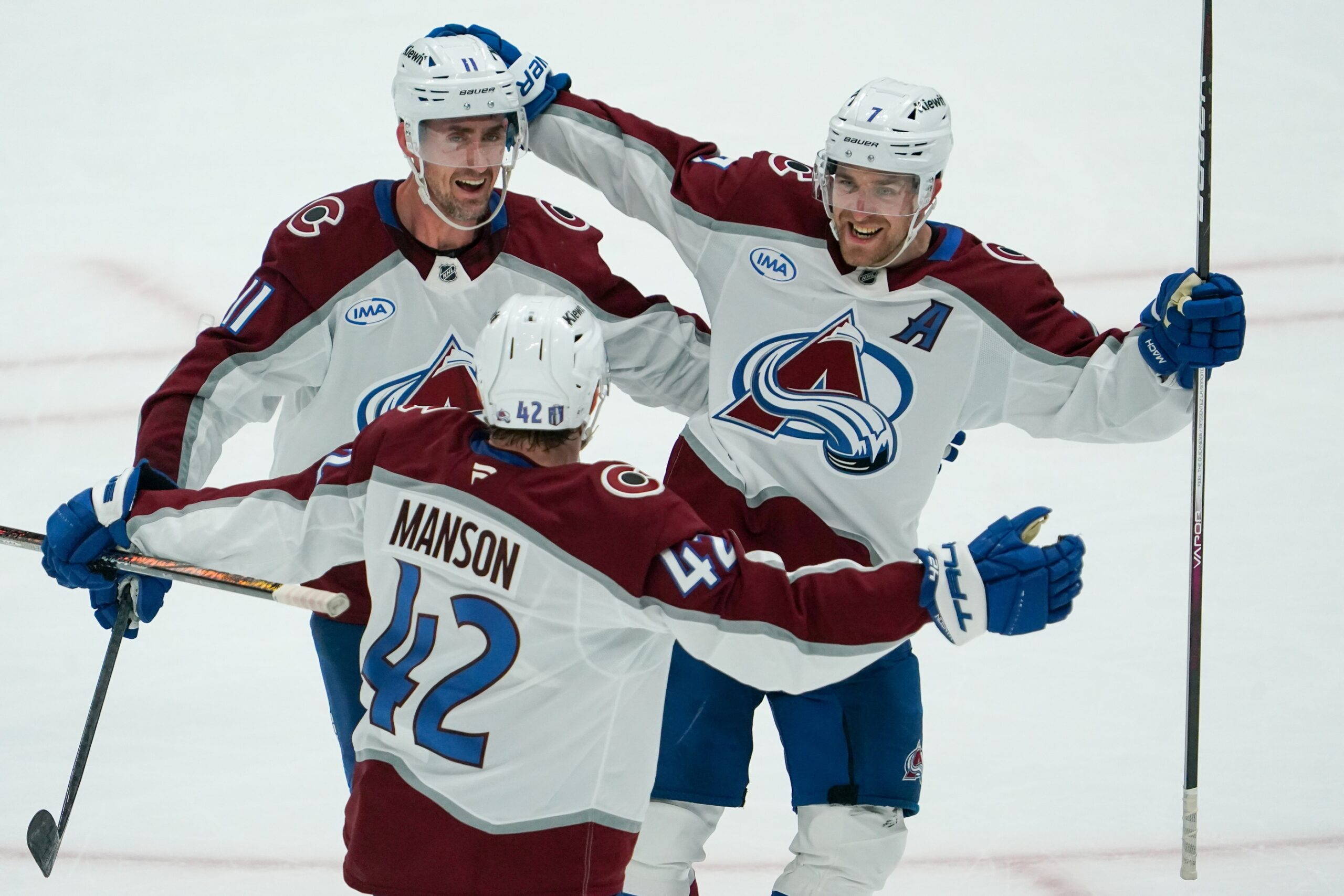 Apr 19, 2025; Dallas, Texas, USA; Colorado Avalanche defenseman Devon Toews (7) celebrates with center Brock Nelson (11) and defenseman Josh Manson (42) after scoring a goal against the Dallas Stars during the third period in game one of the first round of the 2025 Stanley Cup Playoffs at American Airlines Center. Mandatory Credit: Raymond Carlin III-Imagn Images