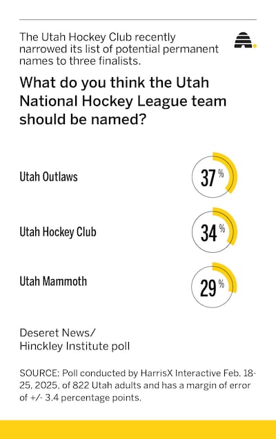 The survey of 822 Utah adults found 37% favor Outlaws and, perhaps surprisingly, 34% chose Utah Hockey Club and 29% like Mammoth.