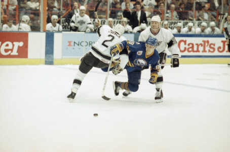 Buffalo Sabres Alexander Mogilny, center, is sandwiched, in between Los Angeles Kings Alexei Zhitnik, left, and Marty McSorley, as he attacks the Kings goal during the first period Nov. 7, 1992, in Inglewood, California.