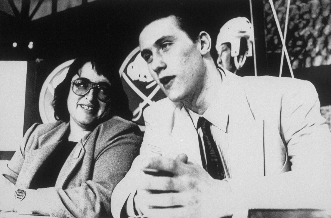 Alexander Mogilny, the 20-year-old Soviet hockey player who defected to the United States last week, answers questions from the press at Buffalo Memorial Auditorium, May 7, 1989. At left is interpreter Ester Findling. Mogilny was drafted by the Buffalo Sabres of the NHL. (AP Photo/Michael Groll)