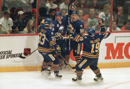 Buffalo Sabres’ Jason Dawe (43) second from left, is congratulated by teammates Mark Astley (33). Alexander Mogilny (89) and Brian Holzinger (19) after scoring a goal in the first period of their NHL Stanley Cup playoff game against the Philadelphia Flyers, Sunday, May 7, 1995, in Philadelphia. (AP Photo/Rusty Kennedy)