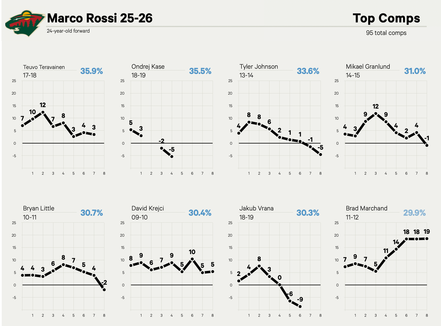 Rossi may not become the most dominant top-six center around. Still, there are some promising signs when looking at his top comparables at 24 years old, from Tyler Johnson and Teuvo Teravainen, to Mikael Granlund, Bryan Little and David Krejci. That’s a fine career path to follow, whether it continues in Minnesota or elsewhere. The worry is that his game never materializes up to those expectations.