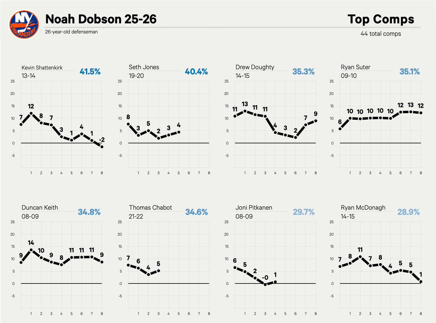 The defensive side of his game just hasn’t always been perfect. Although, unlike 2023-24, the Islanders allowed fewer expected and actual goals against relative to his teammates. Luckily, the Islanders have support around him to balance that out, between Alexander Romanov, Adam Pelech and Ryan Pulock, so the workload can be split accordingly to maximize everyone’s strengths. Maybe having new assistant coaches will help Dobson grow more, too.
