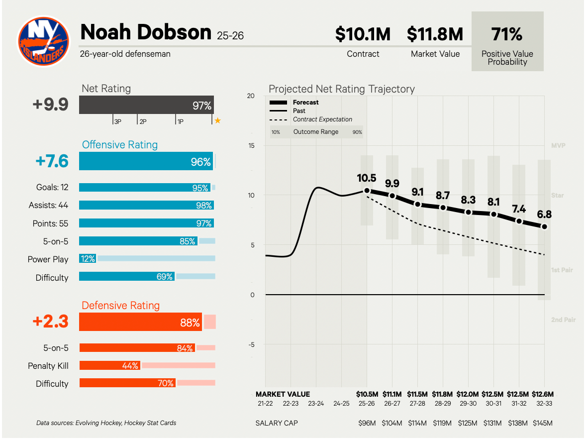 That’s if he and the Islanders can come to a contract agreement this summer. A player of Dobson’s caliber can command a lot, especially in this new-look cap world. He is projected to have a $11.8 million market value, on average, over the next eight years, which represents the highest end deal he can swing for. Evolving-Hockey’s projection for an eight-year extension on Long Island carries a $10.1 million AAV.