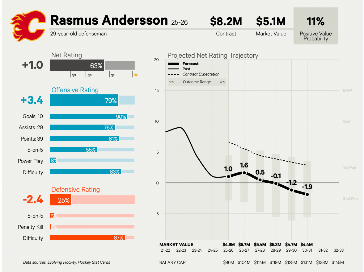 Dom Luszczyszyn recently dove into aging curves and found that defensemen tend to peak between 25 and 27, which is a bit older than previously assumed. So while declines can still be sharp at age 32 and onwards for defensemen, there isn’t that same buyer beware sign on signing someone in their late 20s, either. Plus, a player’s Defensive Rating tends to age pretty well, which works in Andersson’s favor.