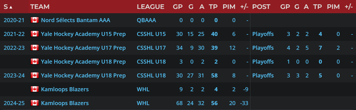 Tommy Lafrenière was born on January 16, 2007 in Saint-Sauveur, Quebec, a town about an hour northwest of Montreal. While Lafrenière was born in Quebec, he grew up in Western Canada and eventually moved to Abbotsford attend Yale Hockey Academy. Now playing in the Western Hockey League, rocking the Kamloops Blazers jersey for a bit over the past year, he has shot himself from non-consideration for the Draft just a year ago to where he is now. Playing for one of the worst teams in the CHL in 2024-25, Lafrenière was fourth on his team in scoring as the team played to a 24-39-5 record. Listed at 5’11” and 170 pounds on Elite Prospects, Lafrenière has made an impression on the few scouts who have seen him with his drive to get to the front of the net.