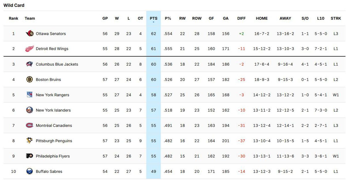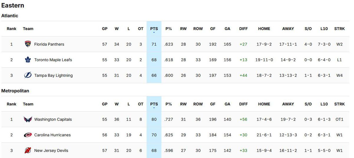 Welcome to the rare edition of Sunday Monday Standings, where we take a look at the Eastern Conference at the time of the NHL’s pause for their international appetizer known as the 4 Nations Face-off.