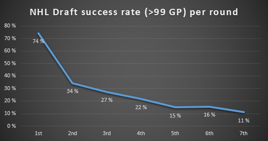 Both great questions. First of all, the main attribute a successful late round pick needs is puck skill. Meeting the minimum threshold of skill required for the NHL is a must. Talking oneself into all attributes needed to become a role player is where the battle is lost before it even begins. Justifications of big strong, penalty killer, fourth line faceoff ace, dependable bottom pair defenseman, etc. Those roles are usually given to veterans and if the main selling point for a developing player is these things it likely means he’s not measuring up in the skill talent department. Skilled players will adapt and finding a diamond in the rough is about identifying where competitors missed their evaluations in the skill set and upside a player possesses. Noting that a player has an aptitude for defense, physicality, and versatility are great secondary attributes but they won’t get a player to the NHL on its own. Opportunity and organizational commitment matters just as much if not more in late round picks as well.