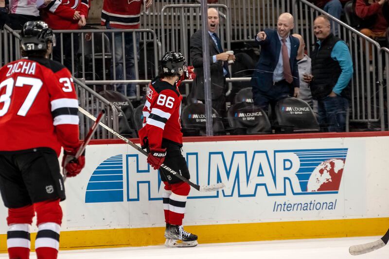 New Jersey Devils president and Utah native Jake Reynolds points at Jack Hughes, Devils alternate captain and former No. 1 overall draft pick. | New Jersey Devils