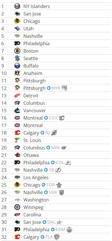 Several 1st round picks in play, especially with clubs with more than one. Pitt will move 11/12 for the right young player. Mtl would move 16/17. Habs need a top 6 F. Philly wants to keep 6, but will trade 22/31. Nashville has 5/23/26 and is still evaluating all options.