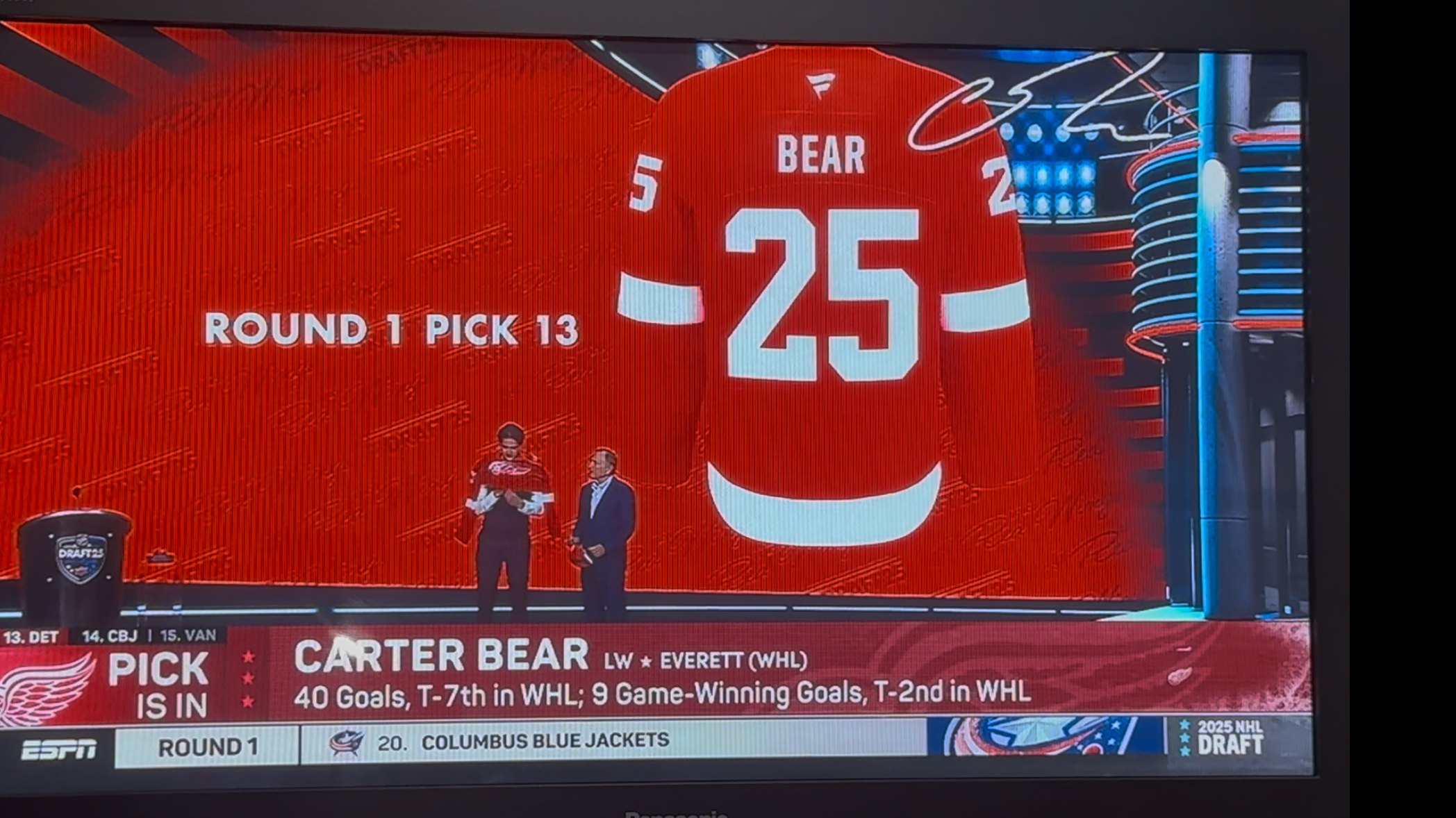 The Wings held the 13th overall selection in the event held on Friday, June 27. Comedy great and Michigan’s own Dave Coulier made the announcement from Detroit, shown on screen at the Peacock Theater in Los Angeles.