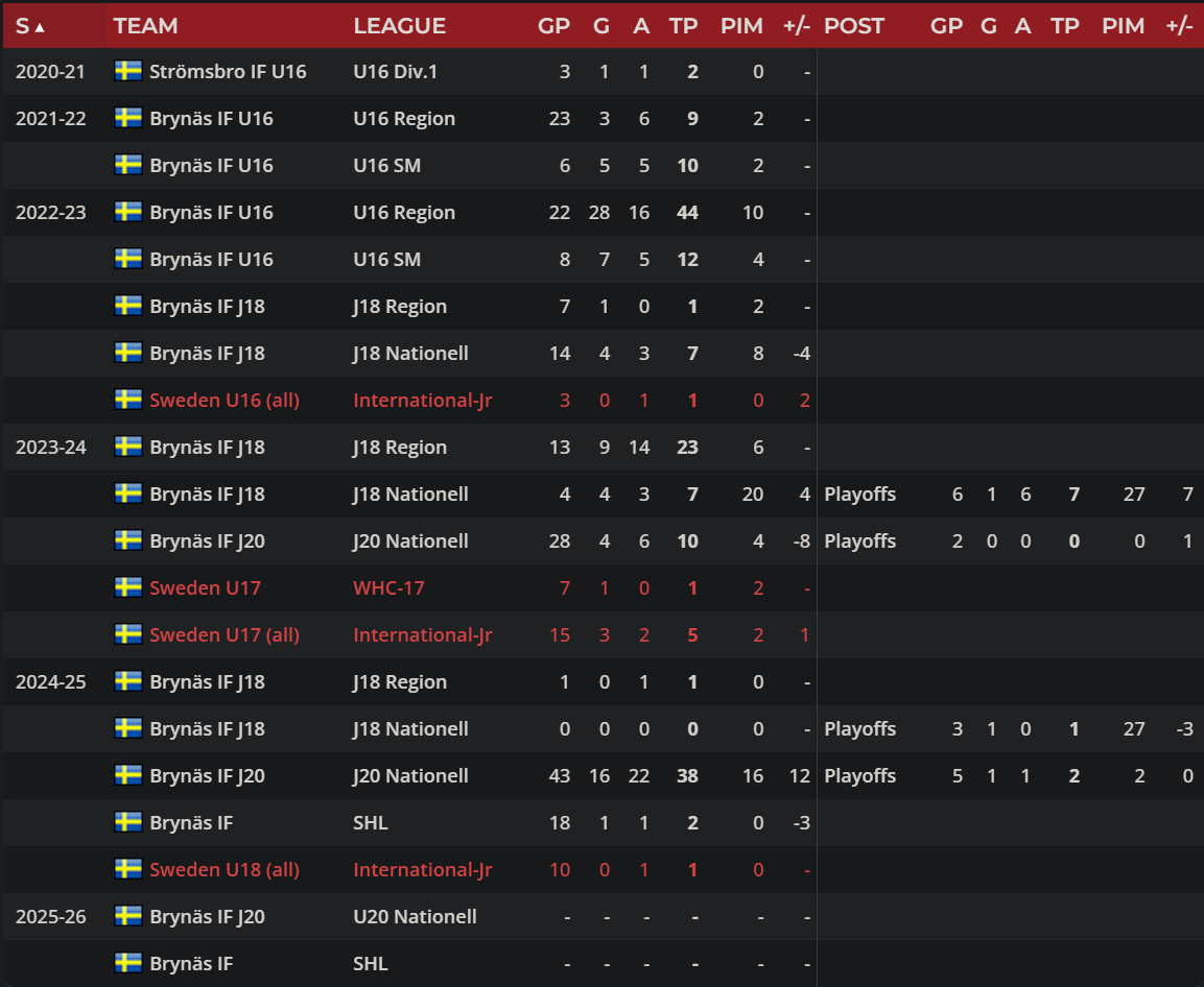 The Devils definitely went into this Draft with a goal in mind: stack the center pipeline. Standing at 6’2” and 176 pounds, Gustav Hillstrom is the first right-handed center to be taken by the New Jersey Devils in the 2025 NHL Draft. Coming off a very solid season for the Brynäs IF J20 team, Hillström hopes to make the professional club in the Swedish Hockey League in the 2025-26 season. Below, you will see his statistics from Elite Prospects.