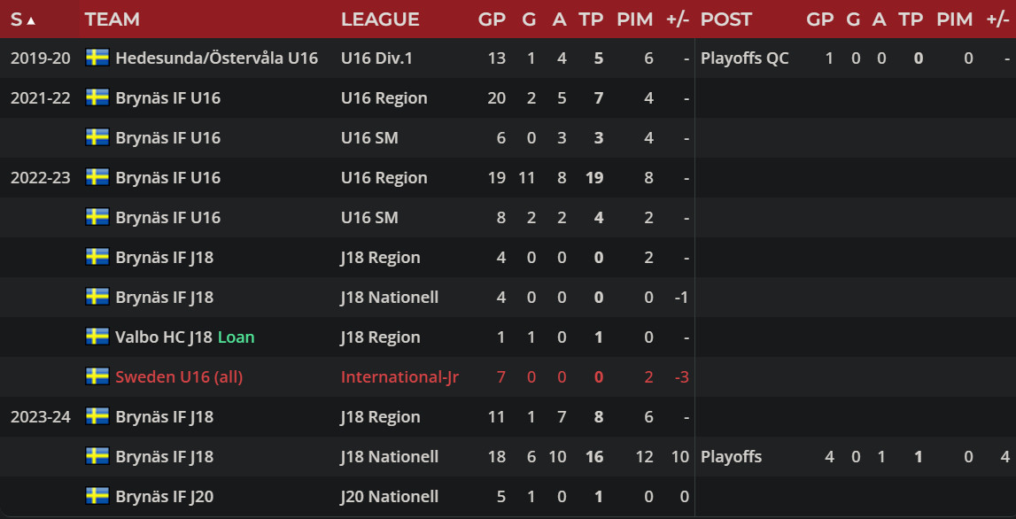 Well, after five forwards and a goaltender, the New Jersey Devils have finally picked a defenseman in the 2025 NHL Draft. A teammate of Gustav Hillström, Holmgren should spend the 2025-26 season in the Swedish J20 Nationell league after playing well in their U18 league in the 2023-24 season. Yes, 2023-24 — Holmgren missed his entire draft year with an injury. I will be looking for what happened there, but I have not seen anything yet. Below, you can see his statistics from Elite Prospects.