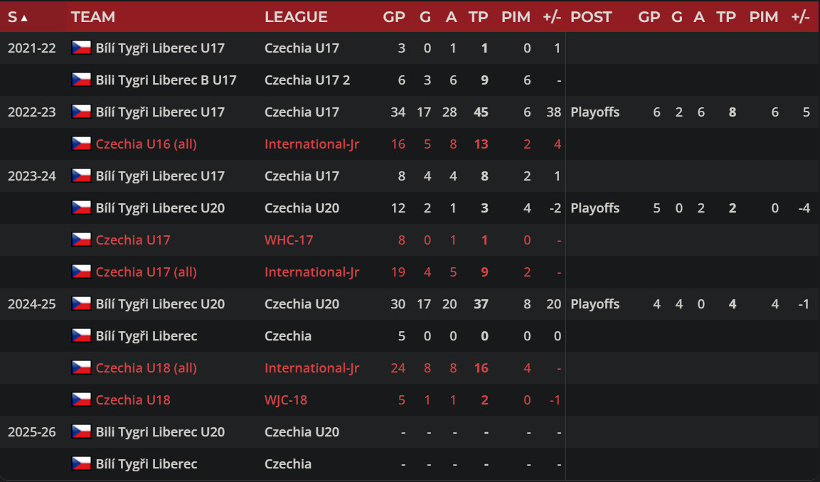 After selecting three centers, a wing, and a goalie with their first five selections of the 2025 NHL Draft, the New Jersey Devils selected their second wing of the day in David Rozsíval. I am a huge fan of this one. Rozsíval is a 6’0” left-shooting right wing from Czechia. He was the 22nd ranked European skater by NHL Central Scouting, and he is set to jump to the big club at Bílí Tygři Liberec after a great season in the Czech U20 league. Below, you can see his Elite Prospects page.