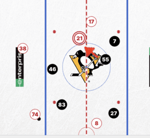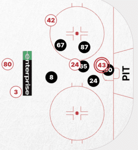 Also, (in the first 35) the Penguins transition game was quite good. They used strong defensive zone pressure to bolt the offensive zone with numbers. It didn’t hurt that Erik Karlsson brought his Team Sweden game and was flying on the wing with the forwards, creating matchup imbalances. The Penguins had a little bit of a rush game, but they also held onto pucks, creating low zone pressure.