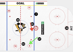 Whoops: Goal 5. Defenseman Ryan Graves covered Alex Ovechkin on the wall–the Penguins were not going to let Ovechkin score Saturday. Graves tightly covered the soon-to-be all-time goals leader closely after a center-ice faceoff. However, Noel Accairi drifted to the puck. Perhaps he was supposed to switch with defenseman Vincent Desharnais? The result was Protas getting behind Acciari for a clean rip on Nedeljkovic. A stoppable goal, but a breakaway nonetheless. Follow the arrows: